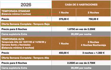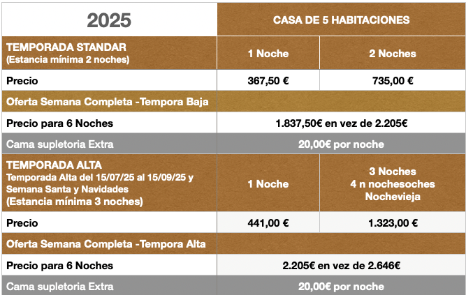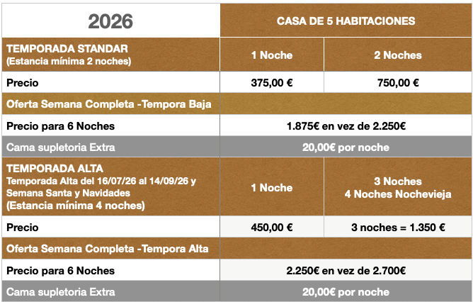 Tiene cinco habitaciones dobles con camas de 105cm y con posibilidad de camas supletorias y dos cuartos de baño completamente equipados.